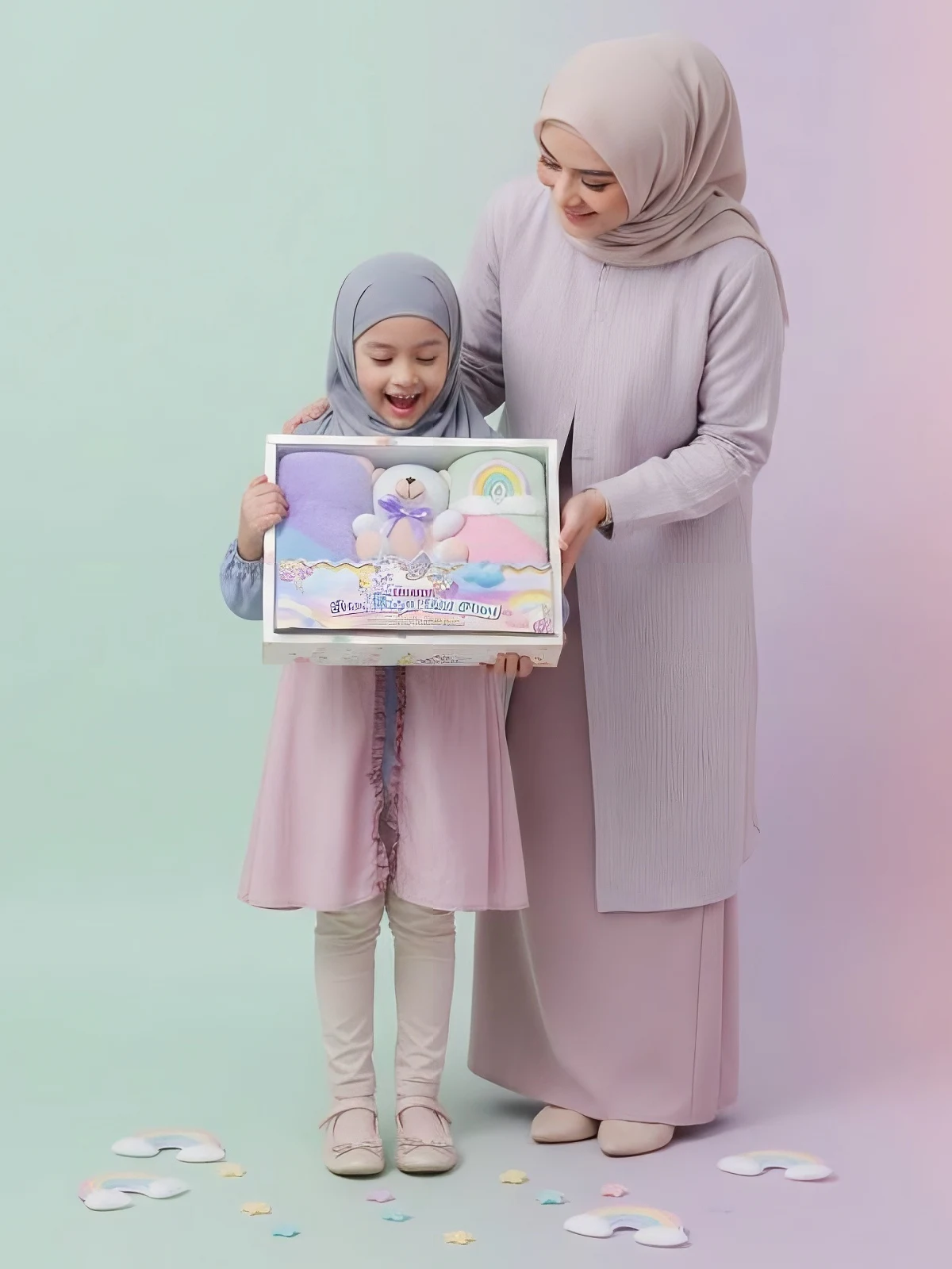Hadiah boneka dan rainbow key chain dikemas dalam box yang lucu.